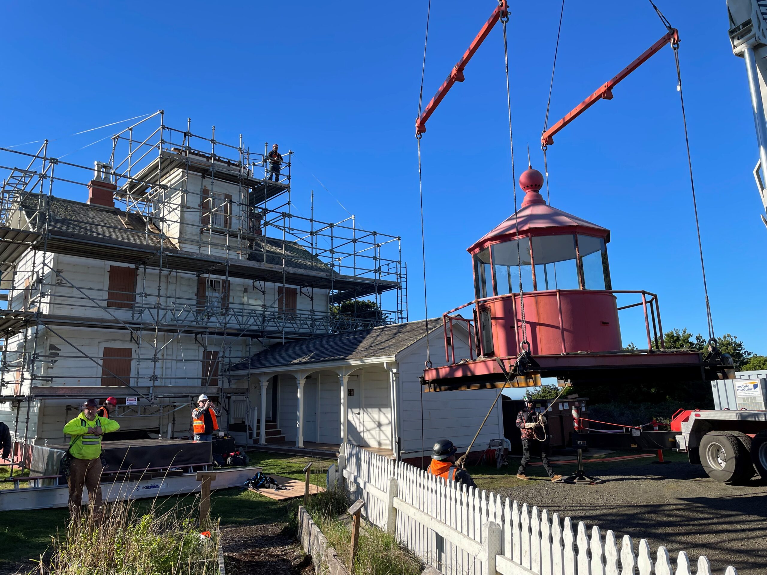 NEWPORT, Oregon— Construction crews will use a crane to lift the approximately 11,000-pound lantern and return it to the top of the historic Yaquina Bay Lighthouse as part of the final stages of an exterior restoration 11 a.m. Monday, Aug. 11.