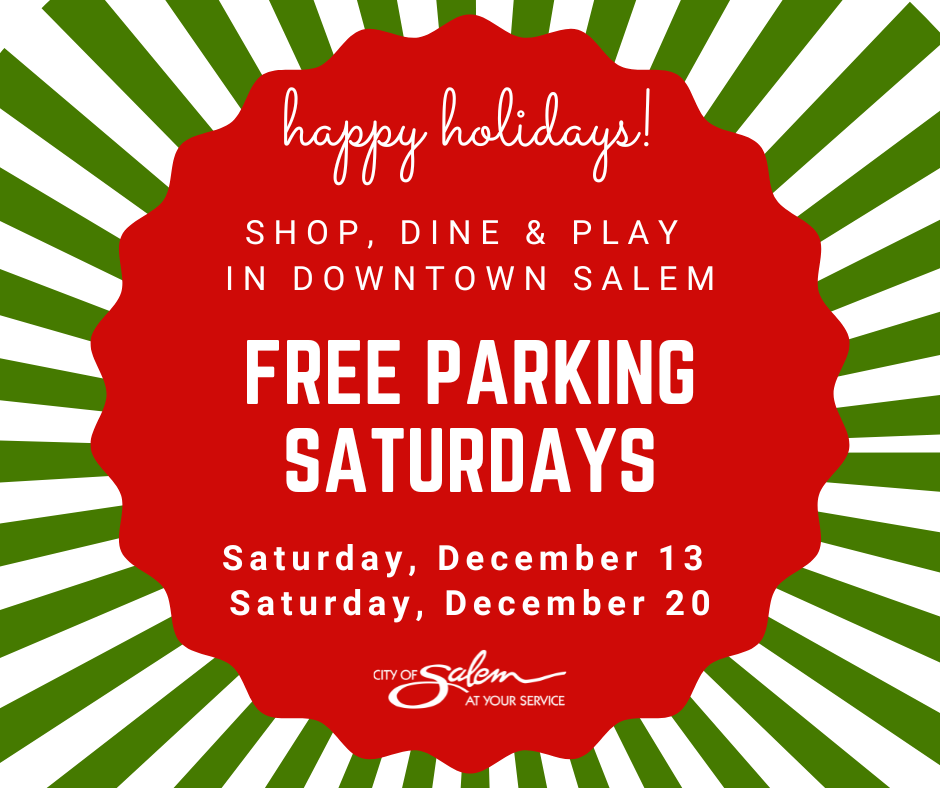 “We are excited to announce free parking for the next two Saturdays. We are grateful that our parking meter programmers were able to do some holiday magic just in time to give Salem a gift. Free downtown parking this Saturday and next Saturday,” said Kristin Retherford, Salem Community Planning and Development Director.