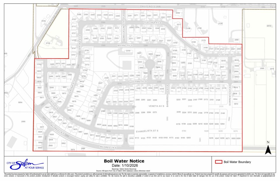 At approximately 7:00 pm on January 10, 2026, a Portland General Electric (PGE) power outage in the S4 water pressure zone in South Salem caused a temporary loss of water pressure when a safety device at the Davis Road Water Pump Station shut down the pumps. Potentially harmful bacteria could be present in the water supply. If these bacteria are present, they could make you sick, and are a particular concern for people with weakened immune systems. The affected area is limited and can be found in the attached map.