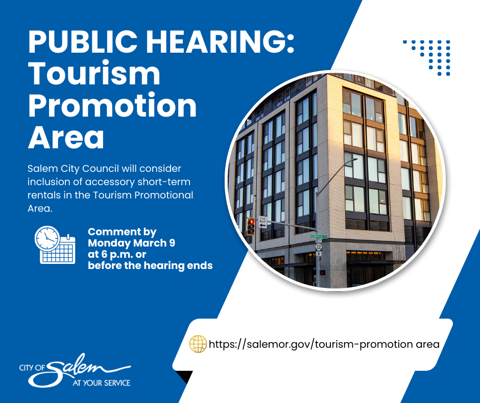 The Tourism Promotional Area will be the subject of a public hearing before the Salem City Council on Monday, March 9. The meeting is set for 6 p.m. at Loucks Auditorium in the Salem Public Library.