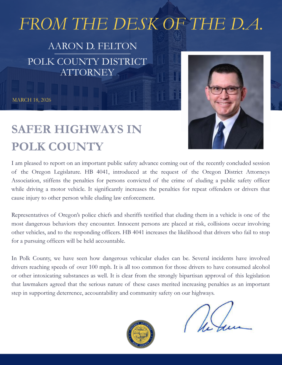 DALLAS (OR) — Today, Polk County District Attorney Aaron D. Felton issued the attached statement highlighting recent changes made by the legislature to the state’s felony elude laws. In a publication titled, “From the Desk of the D.A.,” Felton discusses the law’s increased penalties for violators which are intended to increase accountability and lead to safer highways.