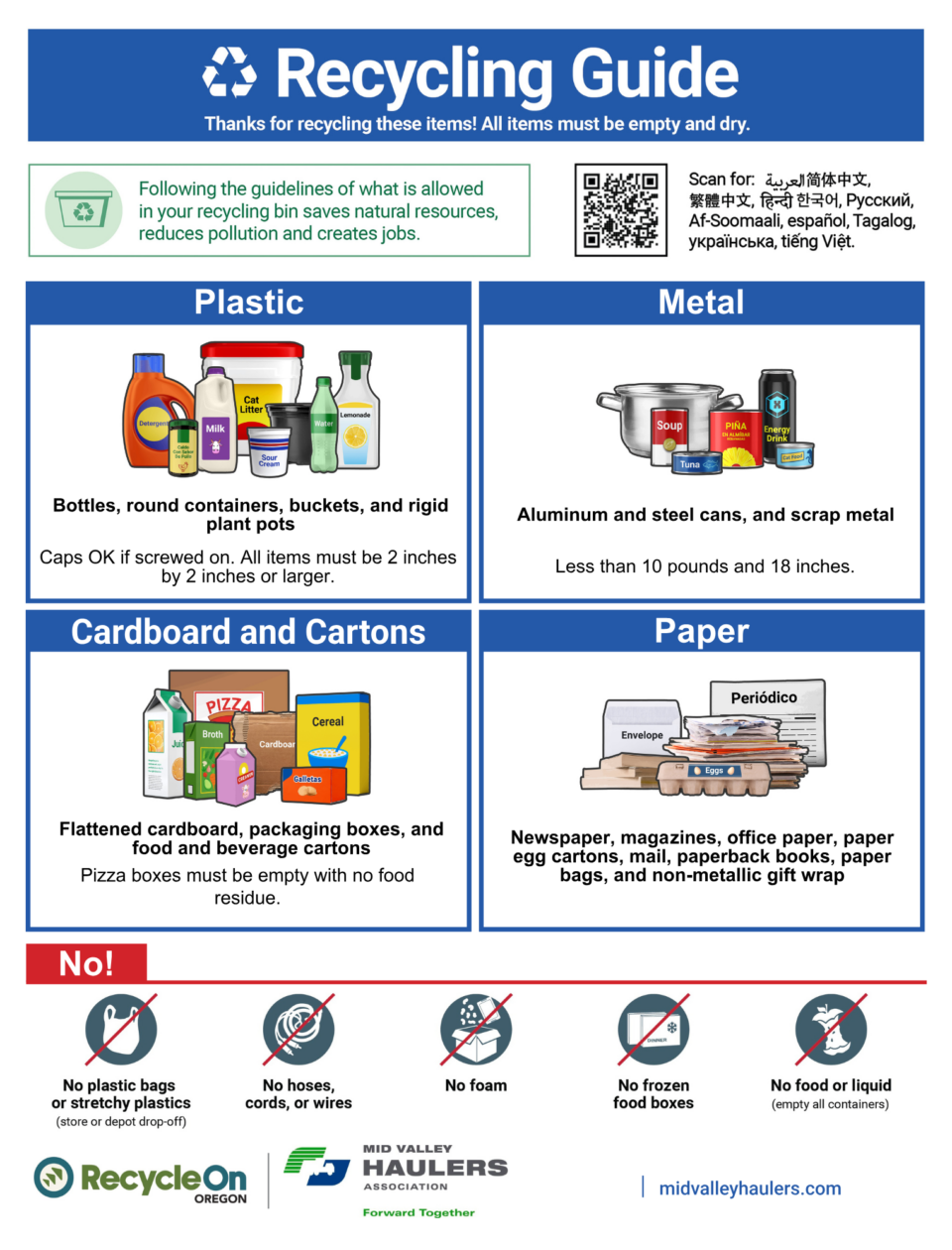 Recycling in Oregon changed starting July 2025 with the roll-out of the Recycling Modernization Act. What does that mean for you? More items are accepted in the blue recycle cart: plastic tubs, plastic buckets, small scrap metal, food and beverage cartons and egg cartons. When everyone does their part, these changes should help keep more recyclable material out of our landfills and pollution out of our environment. Do you have tricky materials that you still aren’t sure where they go? Use the Interactive Waste Guide for detailed instructions on a wide array of materials.