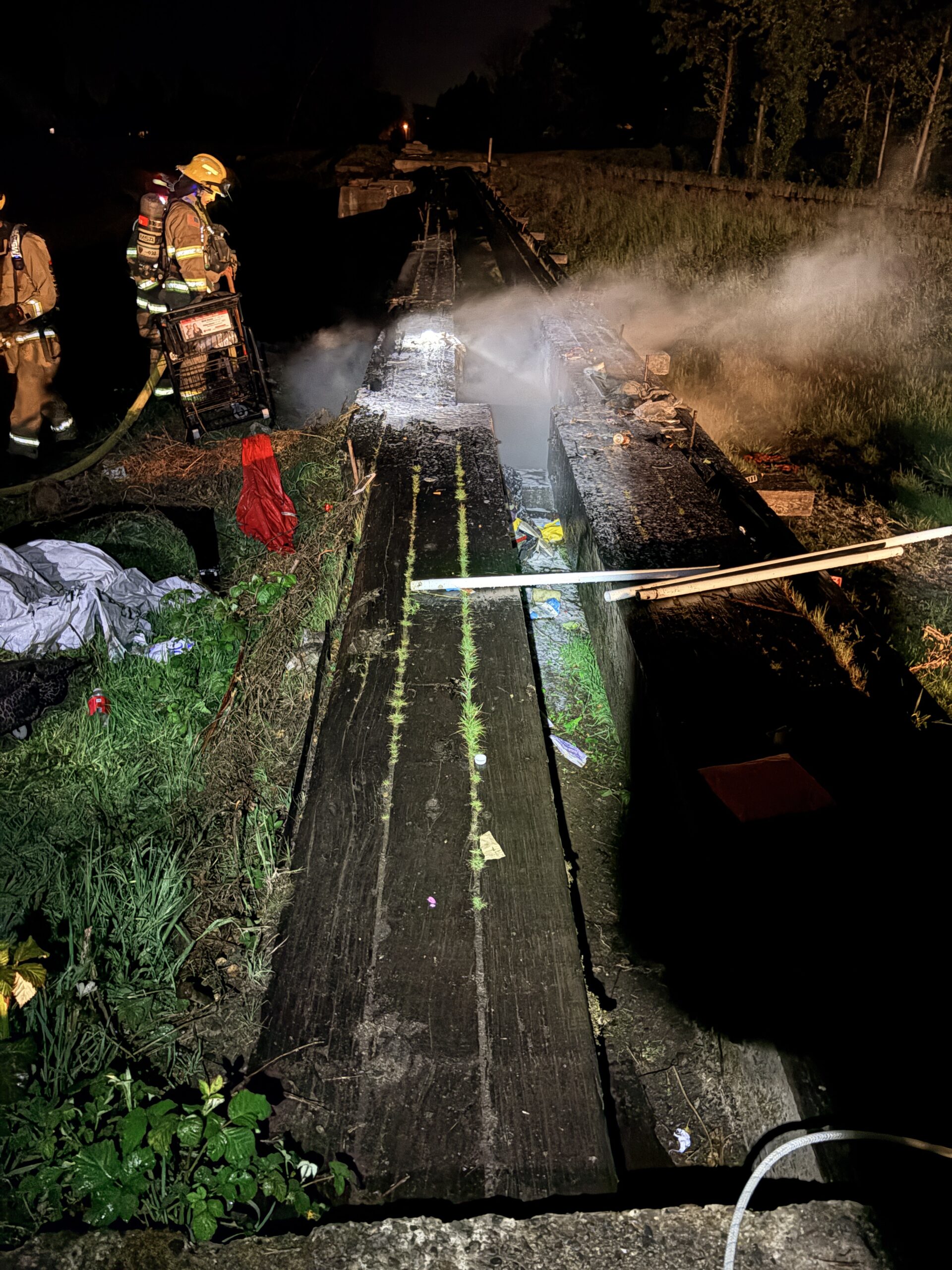 Monday at 8:55 p.m., Lebanon Fire District crews were dispatched to a reported fire at the old mill site in the 800 block of East Milton after a nearby resident observed a large fire burning on the property. The first arriving engine found flames 15–20 feet high coming from underneath an old railroad spur trestle. The area appeared to contain a significant amount of accumulated discarded materials.