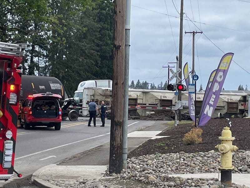 One of the cars on the Portland and Western train struck a semi truck on the north side of the railroad tracks.