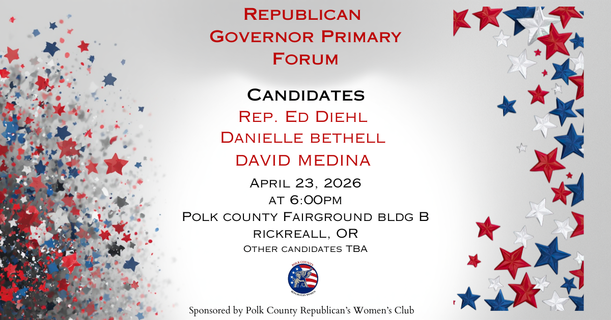 The Polk County Republican Women’s Club are hosting a Republican Governor Primary Forum on April 23, 2026 @ 6 PM. Event location is the Polk County Fairgrounds, Building B in Rickreall Oregon.